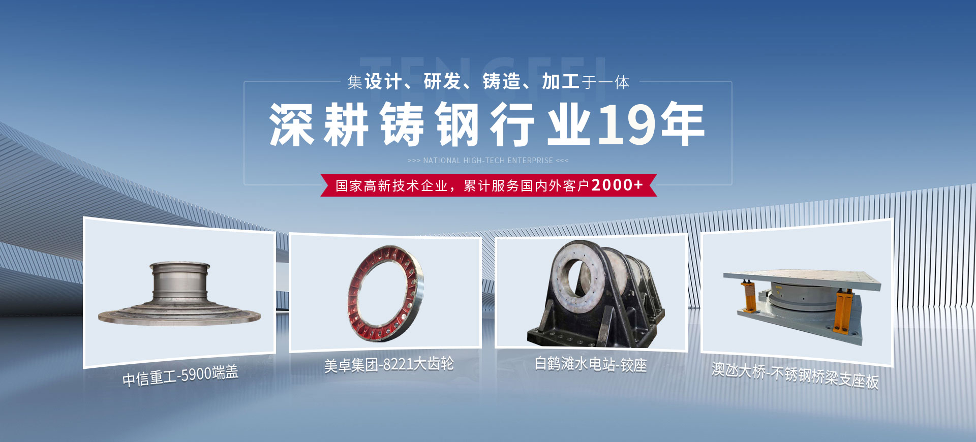 騰飛鑄鋼成立于2006年,位于全國鑄造基地河南省新鄉市,擁有員工300余人,是一家從事150噸以下碳鋼、低合金鋼、不銹鋼鑄鋼件研發、制造、服務為一體的國家高新技術企業?! 」就ㄟ^了ISO9001國際質量管理體系認證,擁有2項發明專 利,2項河南省科技成果、25項實用新型技術,通過了“環保績效評級B級企業”驗收,先后榮獲“河南省鑄造行業綠色發展企業”、 “河南省科技型中小企業”、“河南省專精特新中小企業”等榮譽稱號?! 」緭碛?臺25噸電爐,4臺大型天燃氣熱處理爐、10米回旋自動拋丸機一臺, φ8m數控立車、φ10m數控滾齒機等各類高精裝備100余臺套,年產能3萬余噸,能為客戶提供從產品設計、木模加工、大型鑄造、大型加工一站式服務,產品廣泛應用于建材、冶金、鍛壓、冶金、水工、路橋、化工等多個重型行業。  長期服務于中信重工、中船重工、美卓、上海中交、萊歇、寶武、濟南重工等全球知名企業,在行業內擁有較高的市場知名度和美譽度。
